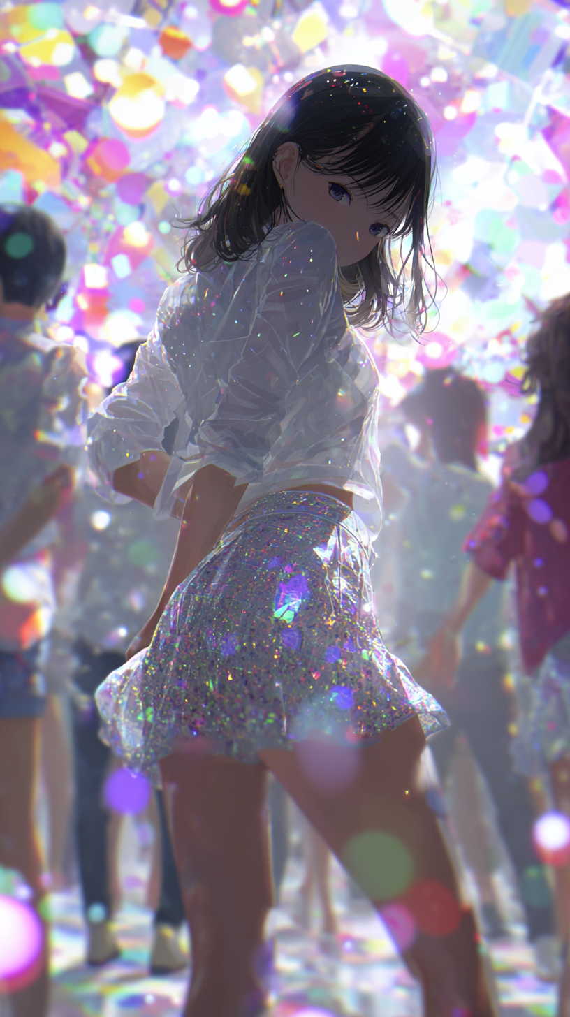 내 스니커즈가 금색 색종이와 반짝이 가루가 뒤범벅된 바닥을 짓이겼다. 밟을 때마다 미세하게 미끄러지는 감각. 바닥은 거울처럼 번들거려, 천장에서 쏟아지는 조명과 우리의 춤추는 다리를 어지럽게 반사했다. 초점이 흐려졌다. 오직 발끝의 감각만이 선명했다.