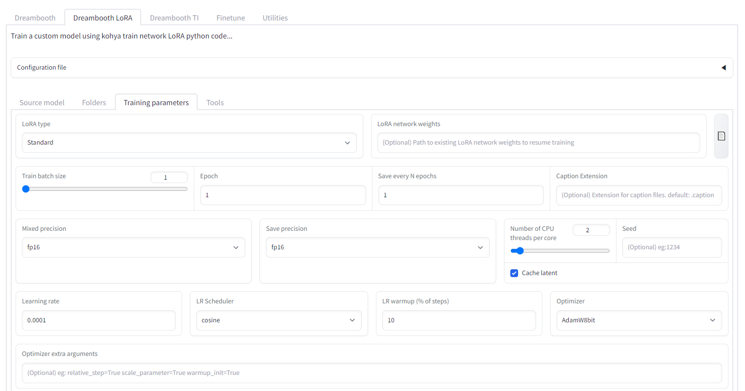 Source, folders, Training parameters, Tool 탭이 보인다.