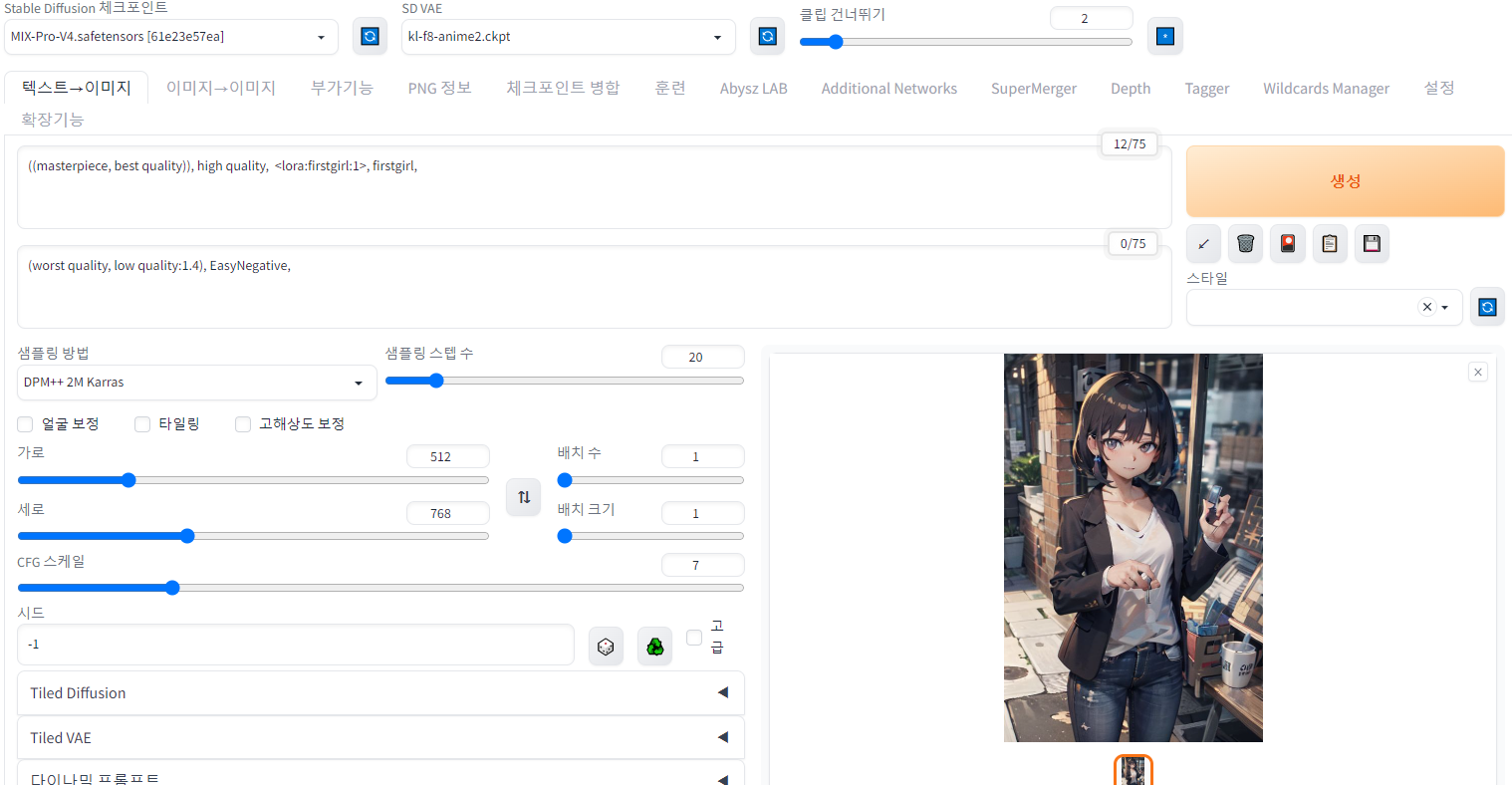1girl을 빼고 firstgirl을 트리거 태그로 넣었기에 firstgirl이라는 태그를 프롬프트에 넣어주었다.